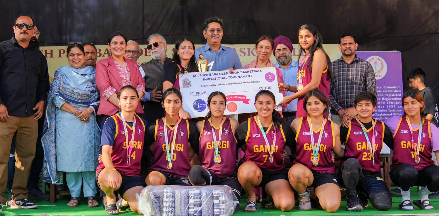The chief guest, Prof. Rajni Abbi (Director, South Campus), along with other dignitaries—Mr. Mukesh Kalia (President, Delhi Basketball Association), Mr. Lalit Watts (Advisor, PSPB), Mr. Ashok Rangeen (General Secretary, DBA), and Dr. Sushil Kumar (Assistant Director, DUSC)—distributed the prizes to the winning and runner-up teams in the presence of Principal of host Sri Guru Tegh Bahadur Khalsa College, Prof. Gurmohinder Singh and DPE Dr. Inderpreet Kaur.