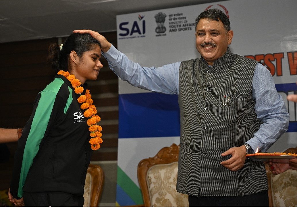 Shri Hari Ranjan Rao, Secretary sports, Government of India giving blessing to Jerlin Jayaratchagan.