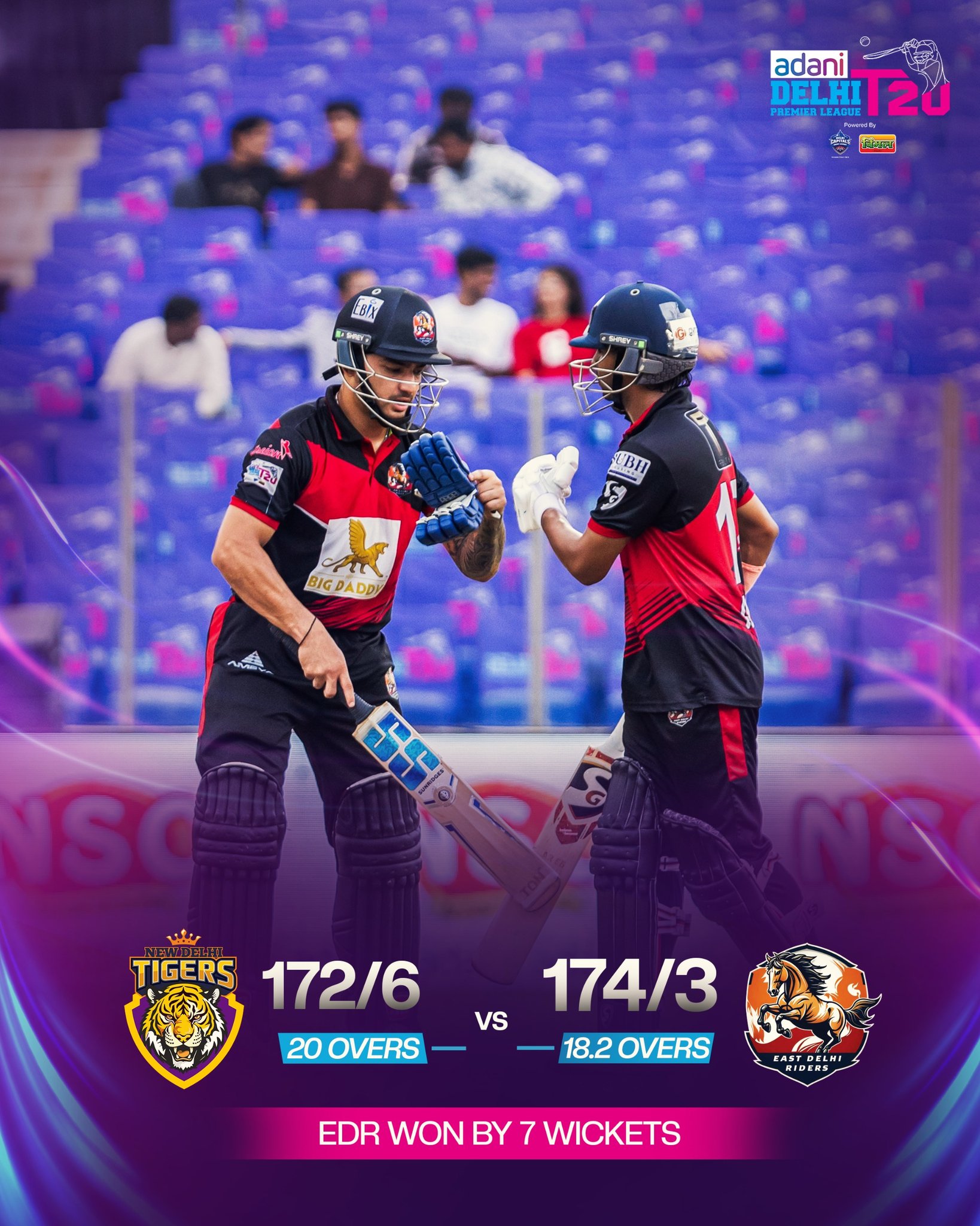 New Delhi: In an entertaining clash on the ongoing Season 2 of the Delhi Premier League (DPL), the East Delhi Riders defeated the New Delhi Tigers by seven wickets at the Arun Jaitley Stadium here. The Riders successfully chased down the target of 173 runs with 3 wickets in hand and 10 balls to spare, winning by 7 wickets in the 18.2 overs as their batting lineup displayed composure and aggression in equal measure, maintaining control throughout their innings and never allowing the required run rate to escalate beyond manageable levels.
