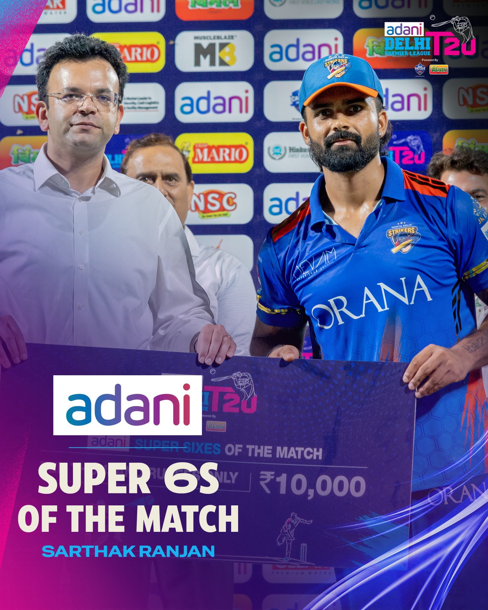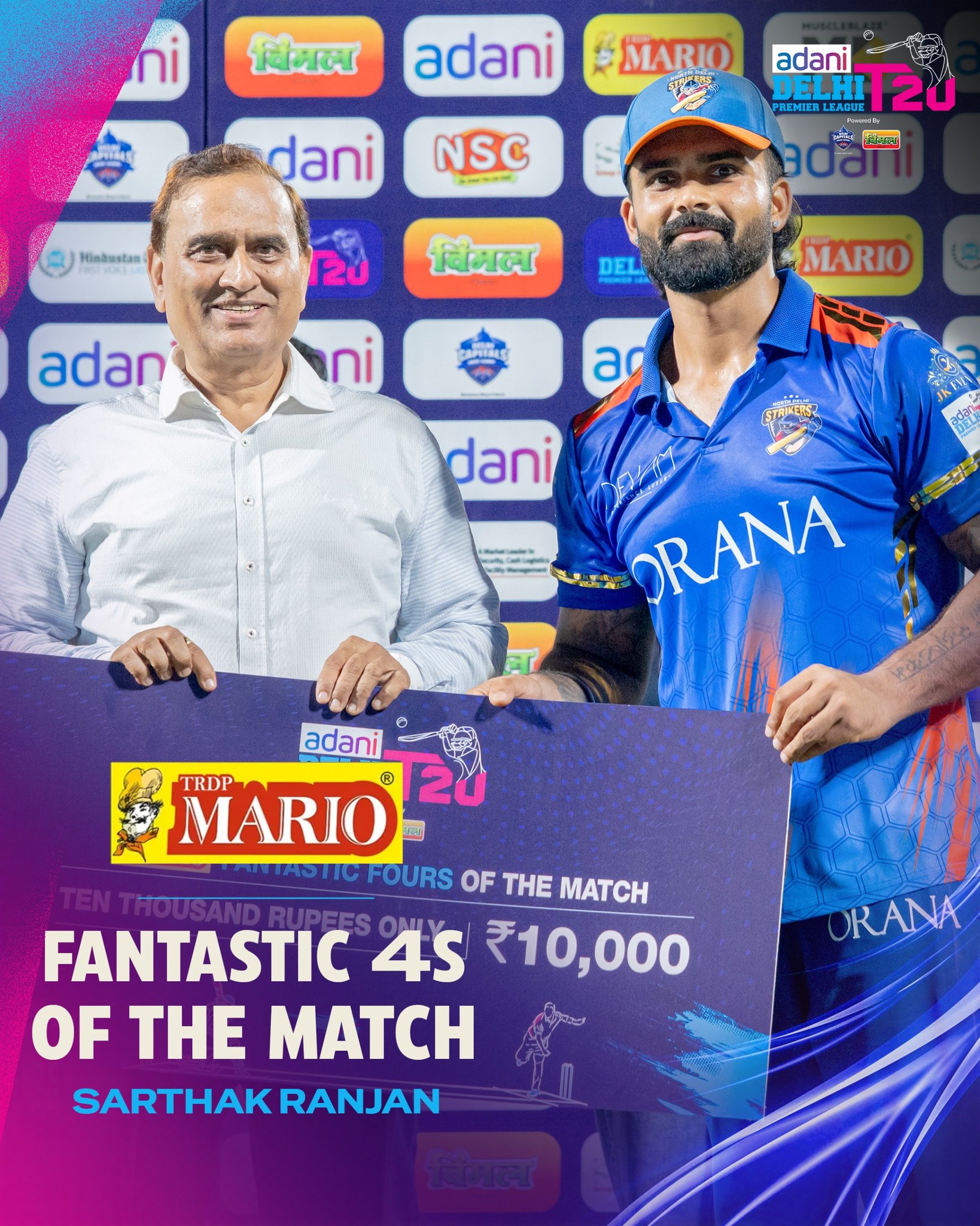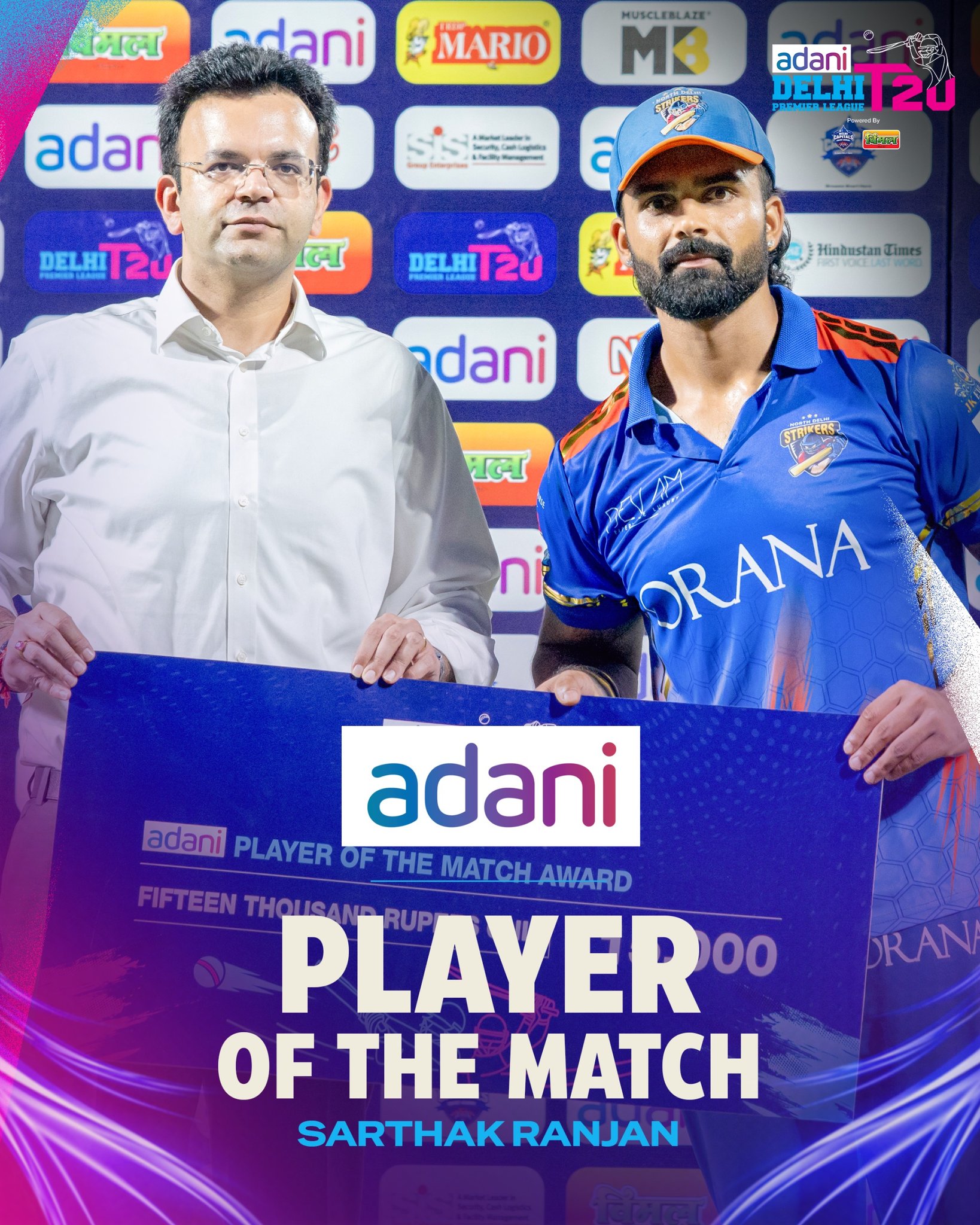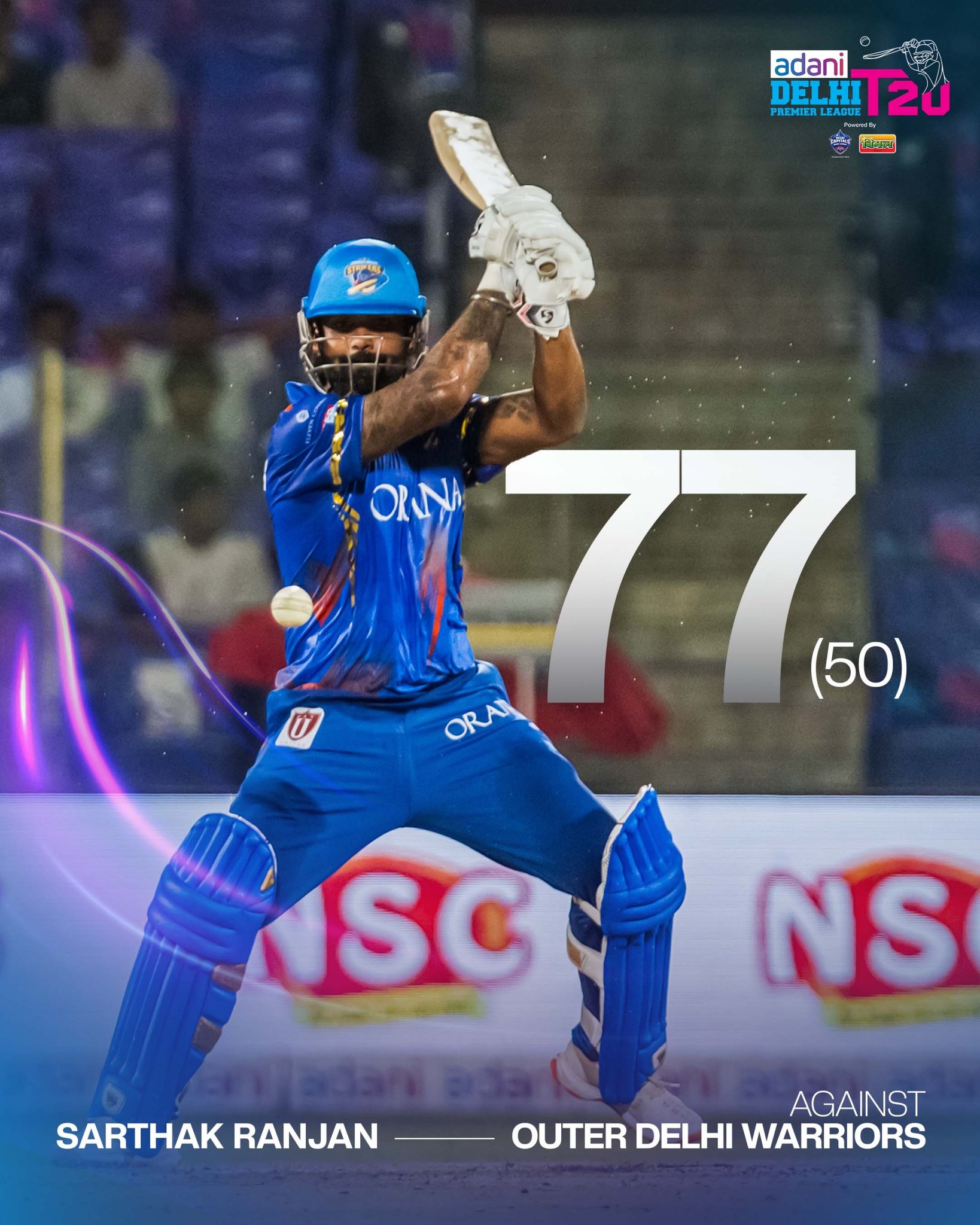 North Delhi Strikers – 163/7 (20) Sarthak Ranjan 77 (50), Vaibhav Kandpal 38 (33), Harsh Tyagi: 2/19.