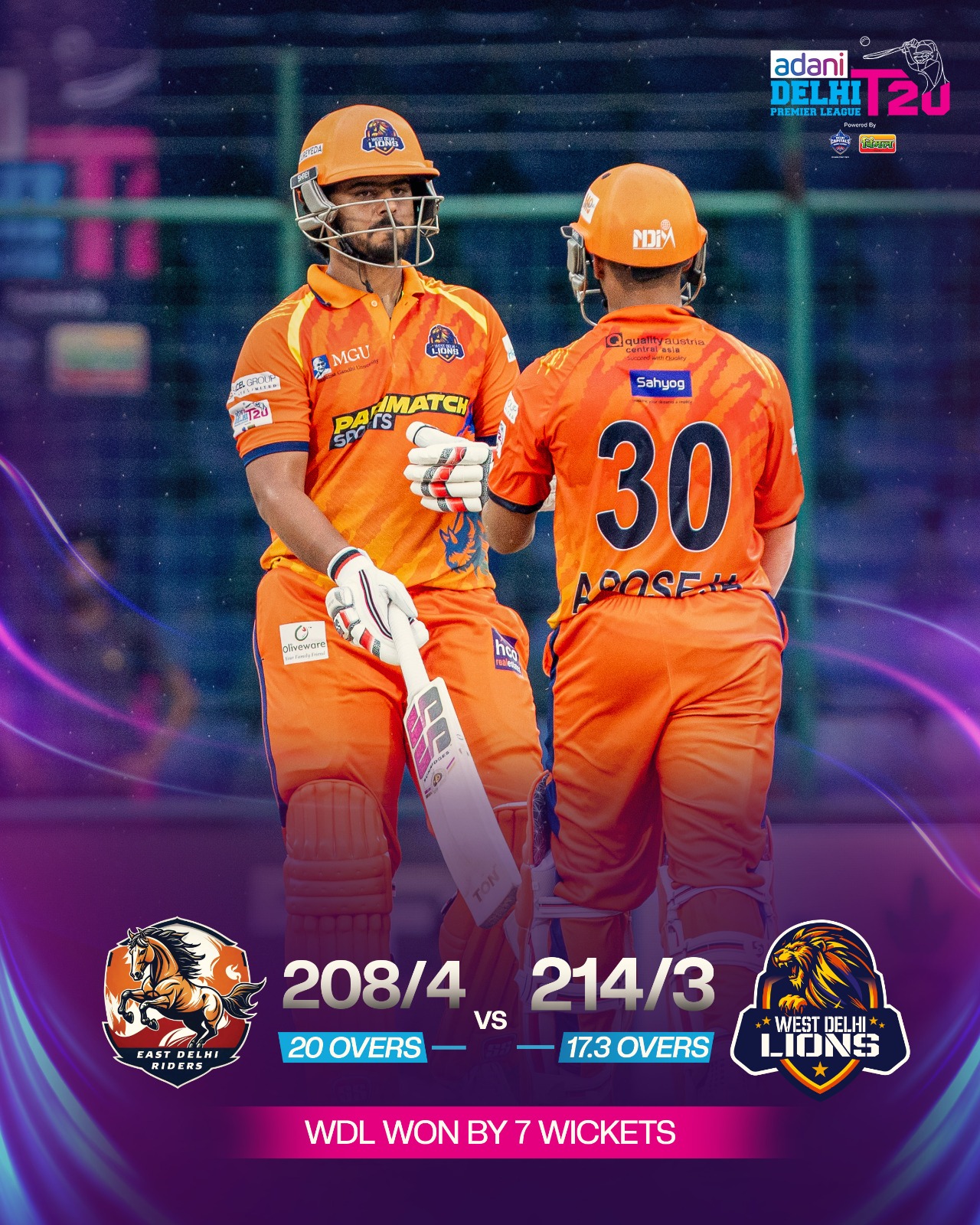New Delhi: High-scoring action continued in the second season of the Delhi Premier League (DPL) as West Delhi Lions pulled off a spectacular run chase, defeating East Delhi Riders by 7 wickets at the Arun Jaitley Stadium.