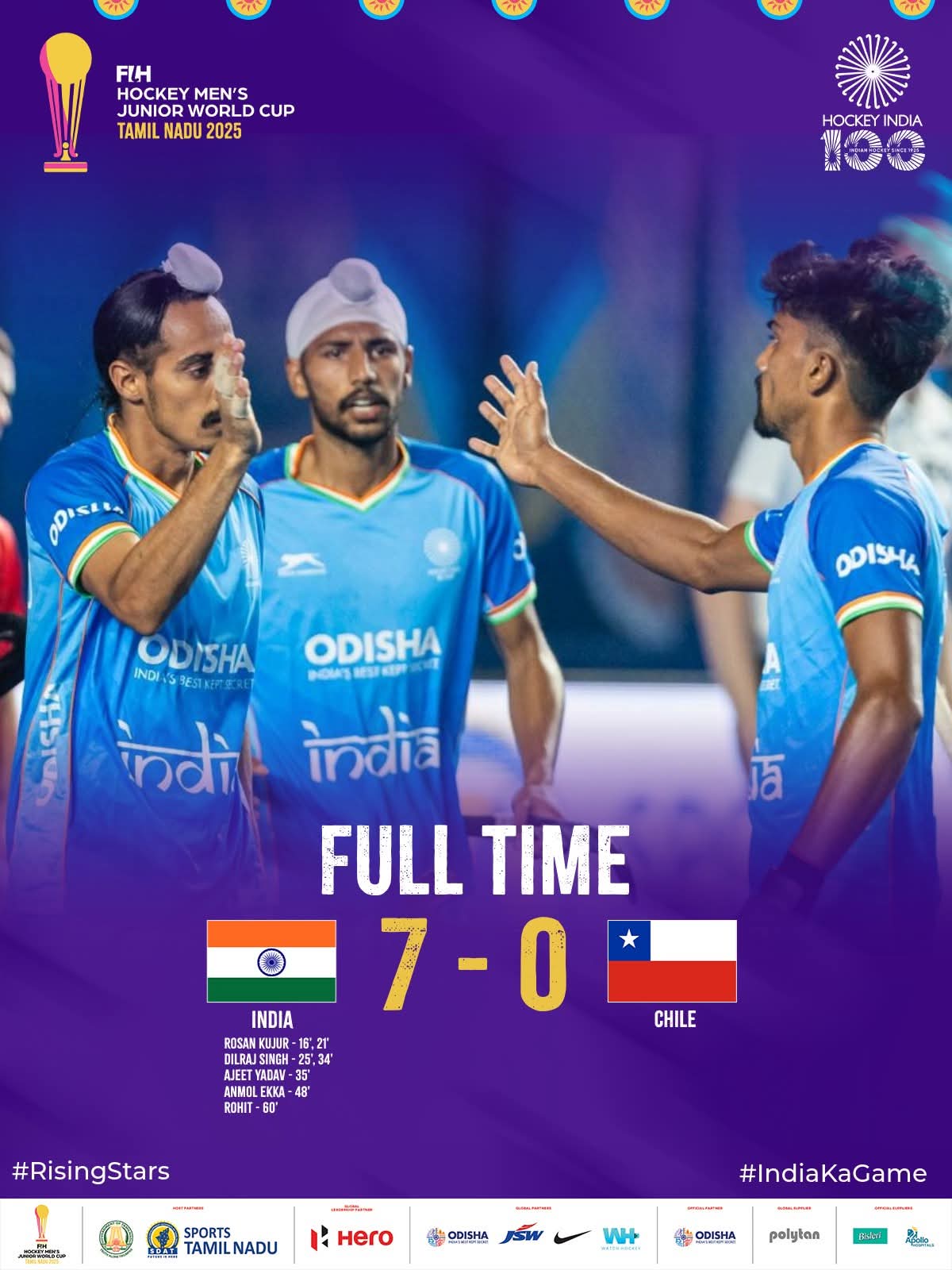 Chennai: The Indian Junior Men’s Hockey Team got off to a rampaging start with a 7-0 win against Chile in their first Pool B match here at the FIH Hockey Men’s Junior World Cup Tamil Nadu 2025 which witnessed a grand opening ceremony on Friday at the Mayor Radhakrishnan Hockey Stadium in Egmore, Chennai. Goals for India were scored by Rosan Kujur (16′, 21′), Dilraj Singh (25′, 34′), Ajeet Yadav (35′), Anmol Ekka (48′) and Rohit (59′). Meanwhile, the Indian goalies Bikramjeet Singh and Prince Deep Singh did exceptionally well to keep a clean slate.
