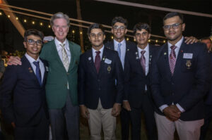 Chairman of Augusta National Golf Club and the Masters Tournament Fred S. Ridley joins Ranveer Mitroo of India, Anshul Mishra of India, Raghav Gulati of India, Rakshit Dahiya of India and Harman Sachdeva of India at the Welcome Reception at the Royal Majlis on the eve of the 2025 Asia-Pacific Amateur Championship being played at the Emirates Golf Club Majlis Course in Dubai, United Arab Emirates on Wednesday 22 October 2025. Photograph by AAC.