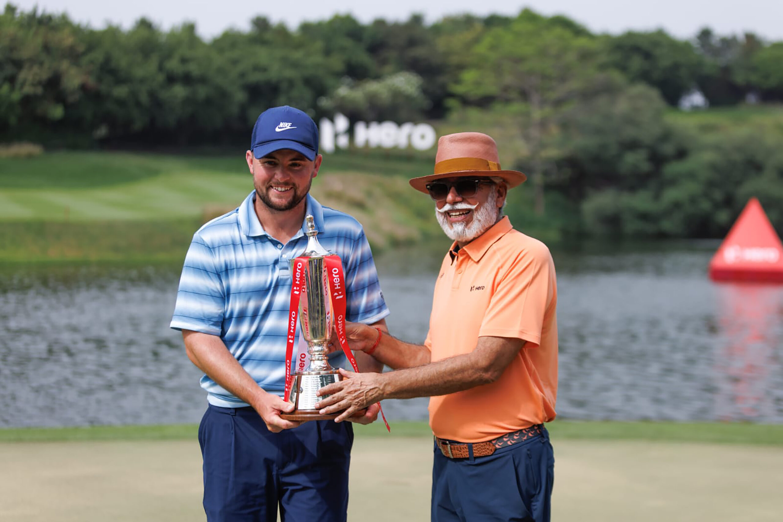Alex Fitzpatrick received the Hero Indian Open Trophy from Dr Pawan Munjal, Executive Chairman of Hero MotoCorp.