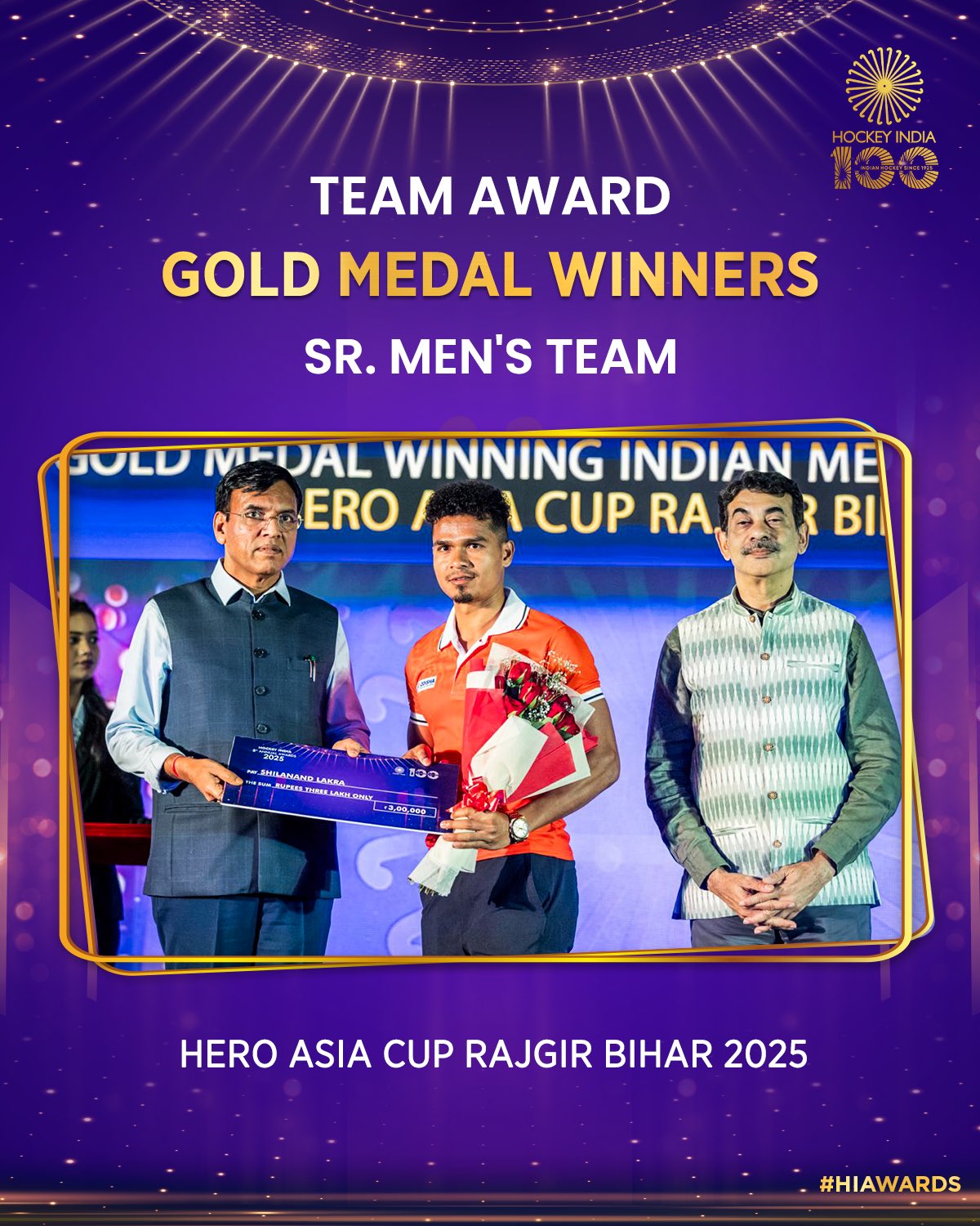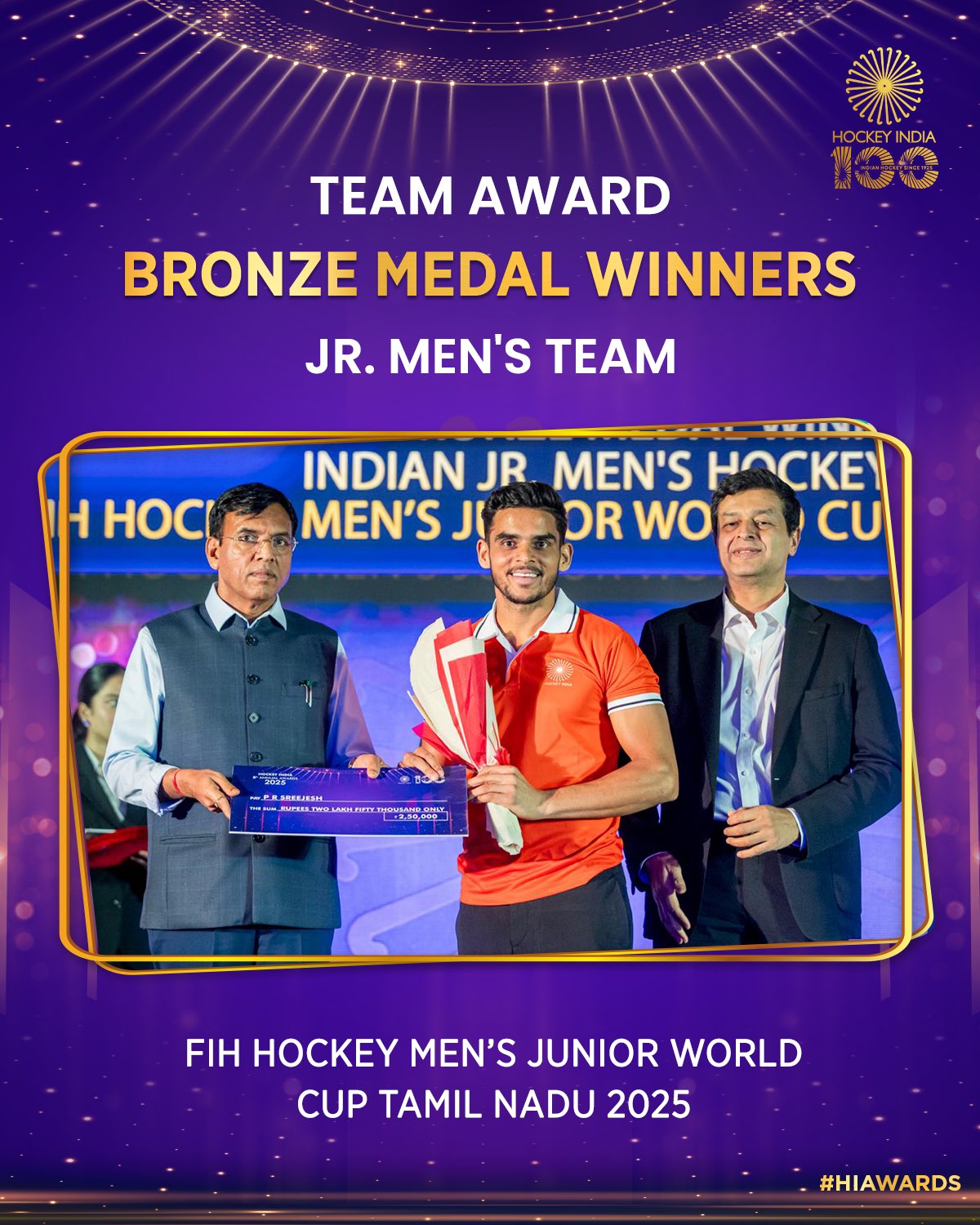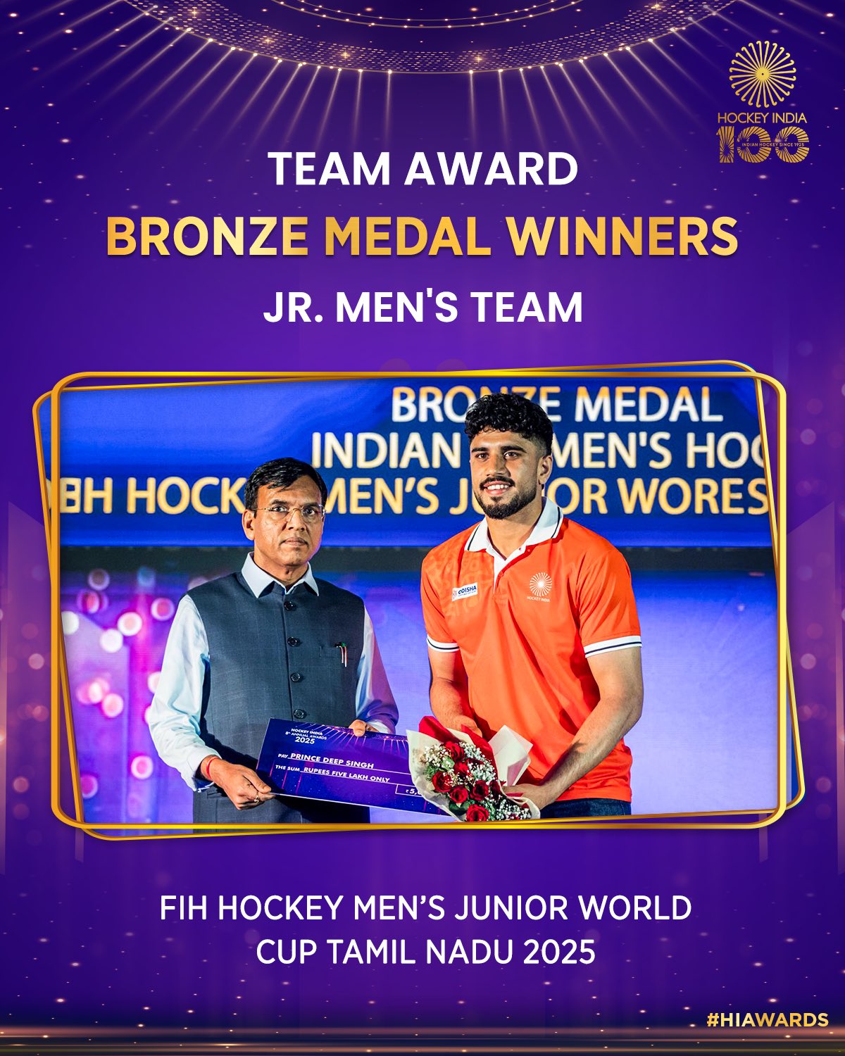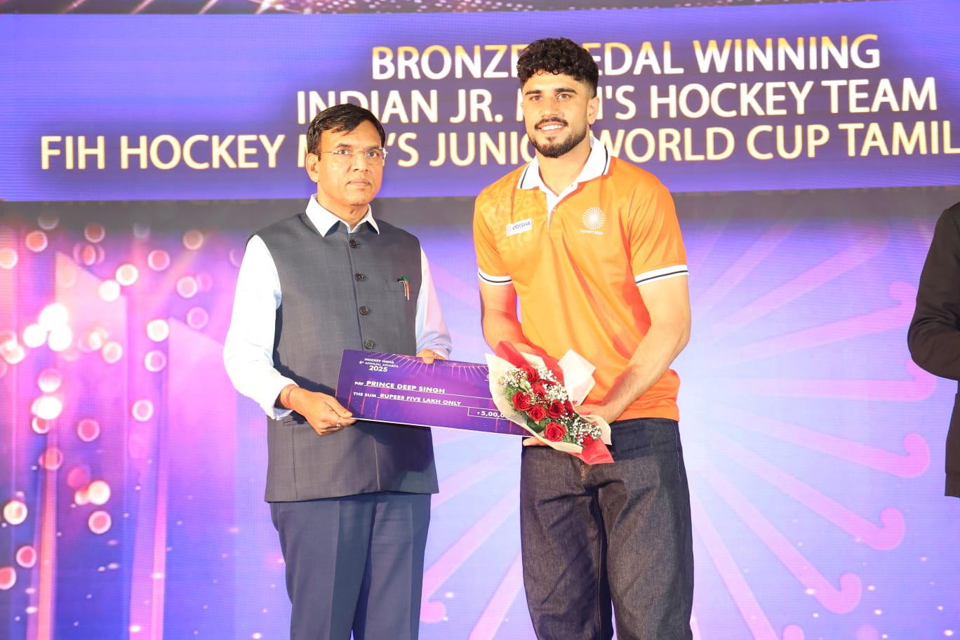 The gold medal-winning Men’s Hockey Team from the Hero Asia Cup Rajgir Bihar 2025 were felicitated during the ceremony, with each player receiving INR 3 lakh and the support staff receiving INR 1.5 lakh each. The bronze medal-winning Indian Junior Men’s Hockey Team from the FIH Hockey Men’s Junior World Cup Tamil Nadu 2025 were also honoured, with players receiving INR 5 lakh each and support staff receiving INR 2.5 lakh each.