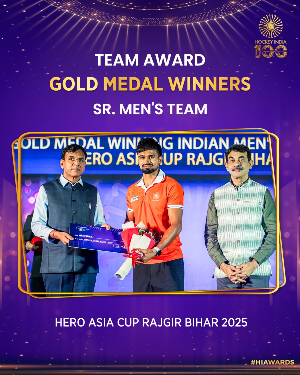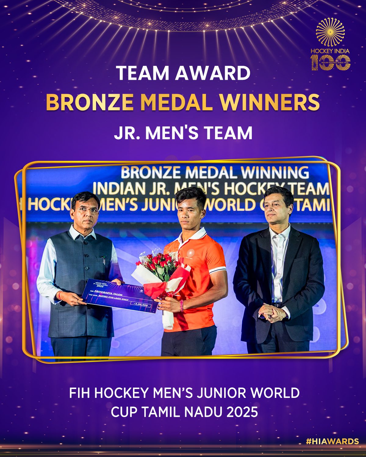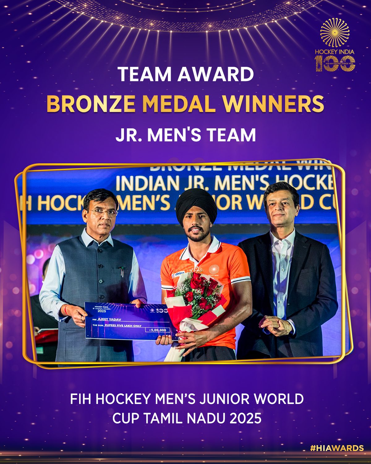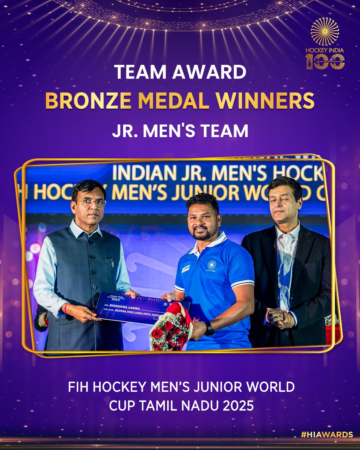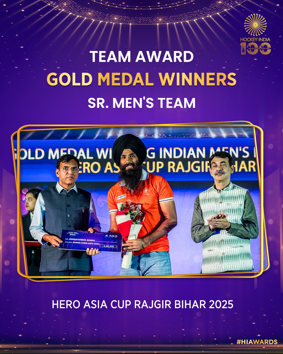 The gold medal-winning Men’s Hockey Team from the Hero Asia Cup Rajgir Bihar 2025 were felicitated during the ceremony, with each player receiving INR 3 lakh and the support staff receiving INR 1.5 lakh each. The bronze medal-winning Indian Junior Men’s Hockey Team from the FIH Hockey Men’s Junior World Cup Tamil Nadu 2025 were also honoured, with players receiving INR 5 lakh each and support staff receiving INR 2.5 lakh each.