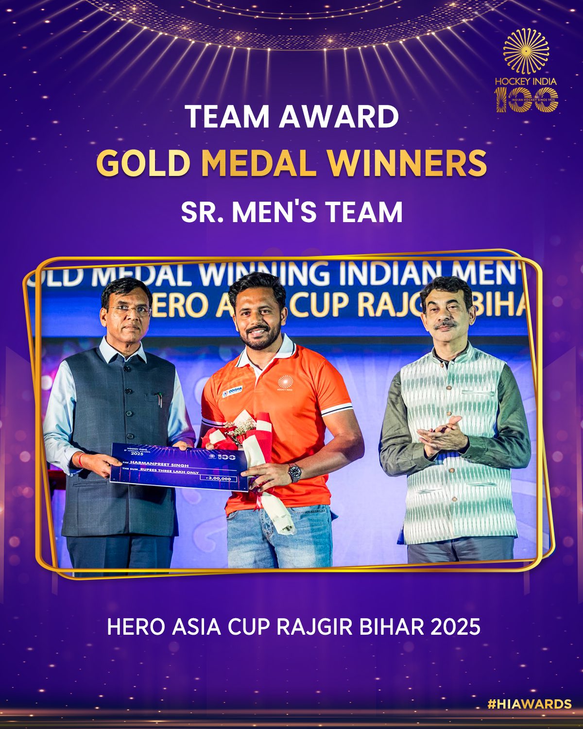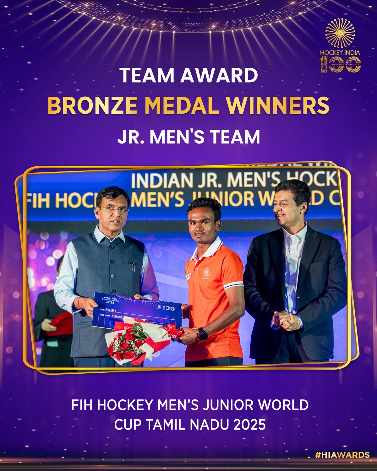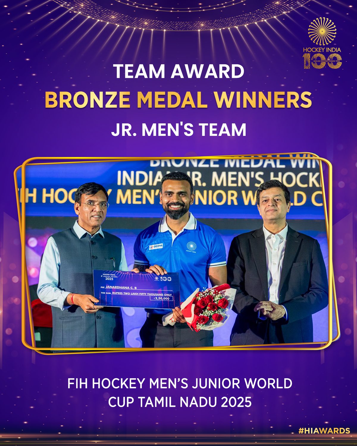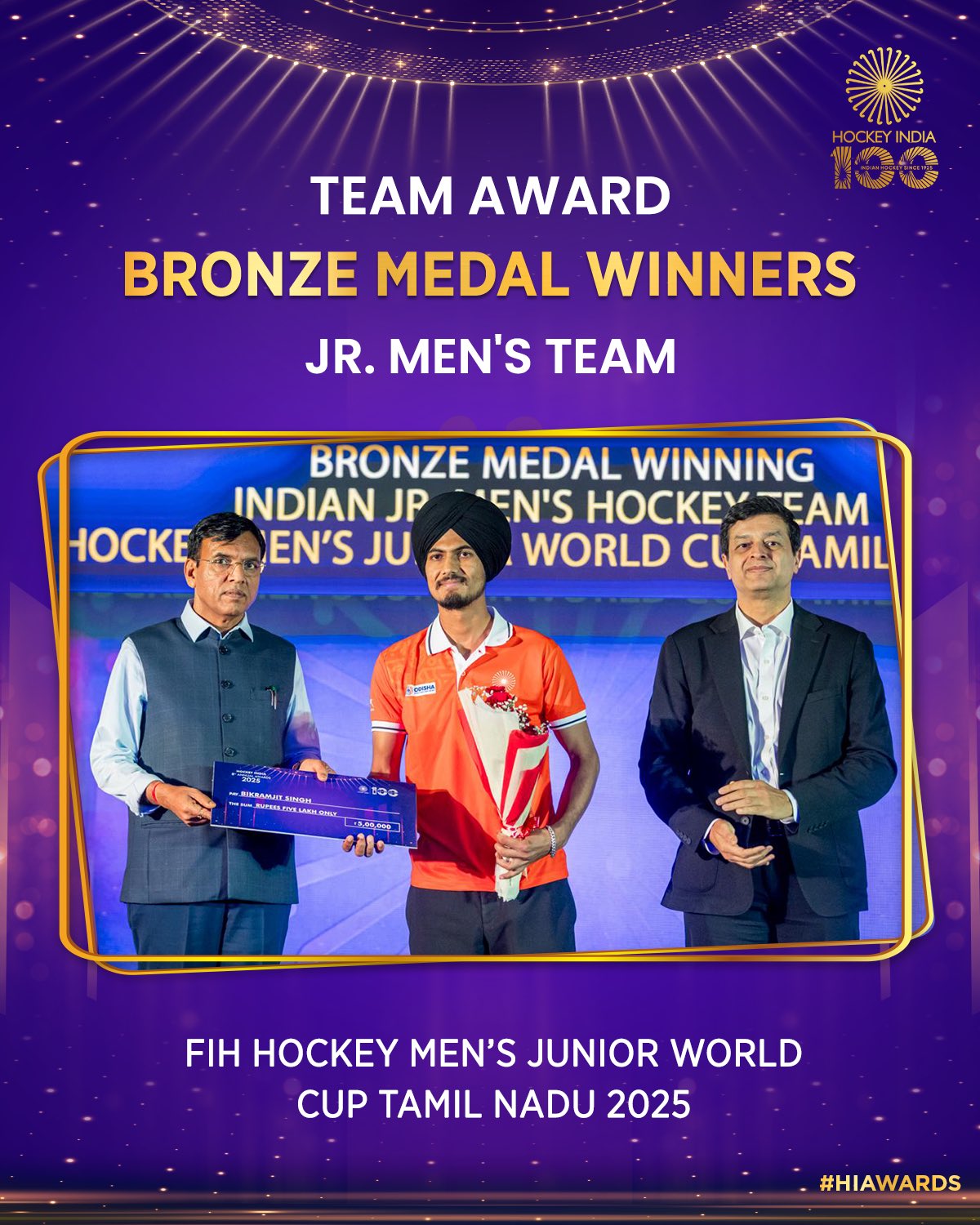 The gold medal-winning Men’s Hockey Team from the Hero Asia Cup Rajgir Bihar 2025 were felicitated during the ceremony, with each player receiving INR 3 lakh and the support staff receiving INR 1.5 lakh each. The bronze medal-winning Indian Junior Men’s Hockey Team from the FIH Hockey Men’s Junior World Cup Tamil Nadu 2025 were also honoured, with players receiving INR 5 lakh each and support staff receiving INR 2.5 lakh each.