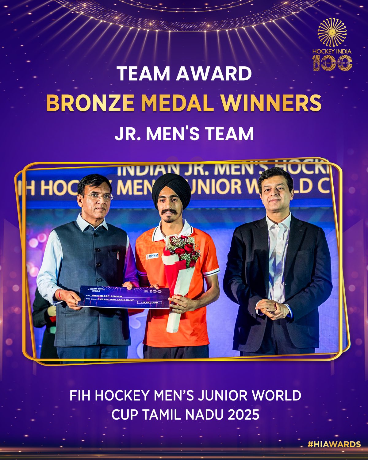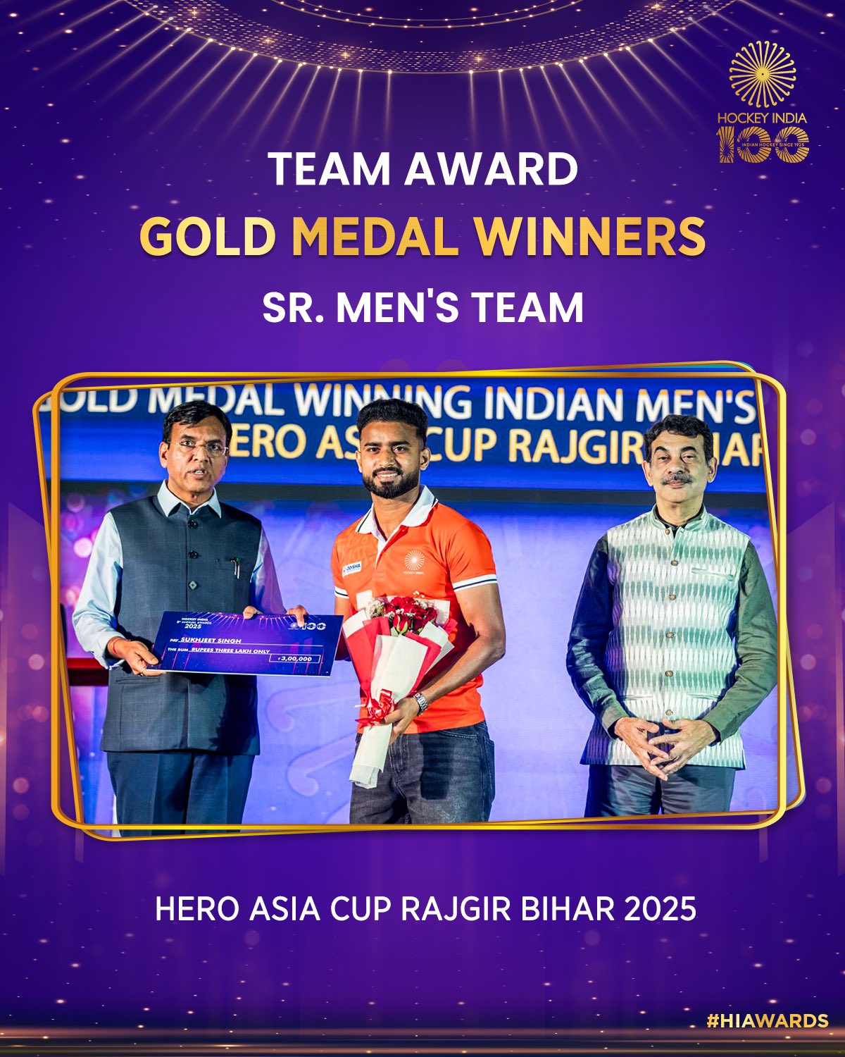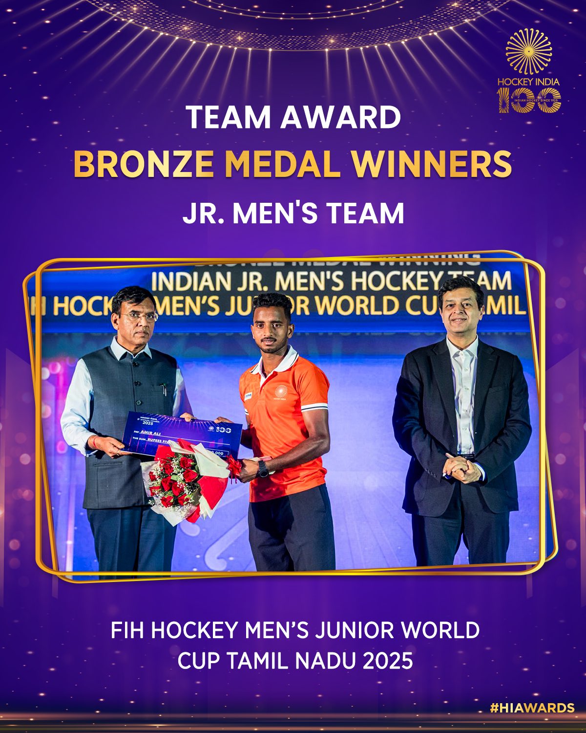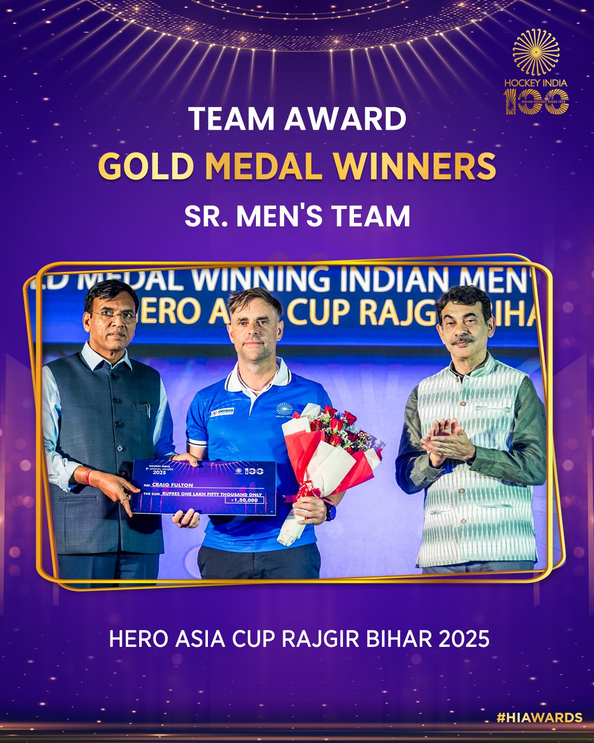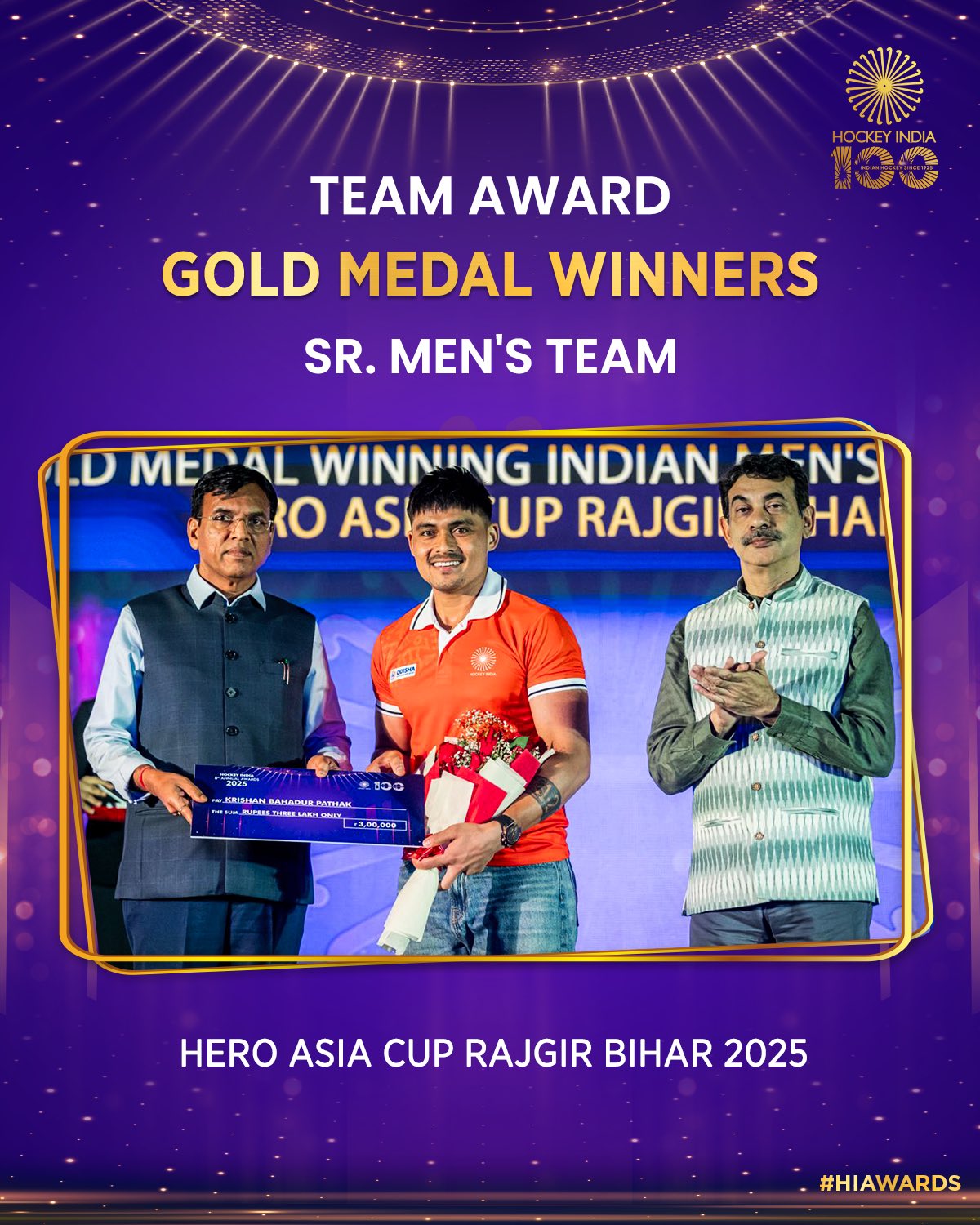 The gold medal-winning Men’s Hockey Team from the Hero Asia Cup Rajgir Bihar 2025 were felicitated during the ceremony, with each player receiving INR 3 lakh and the support staff receiving INR 1.5 lakh each. The bronze medal-winning Indian Junior Men’s Hockey Team from the FIH Hockey Men’s Junior World Cup Tamil Nadu 2025 were also honoured, with players receiving INR 5 lakh each and support staff receiving INR 2.5 lakh each.