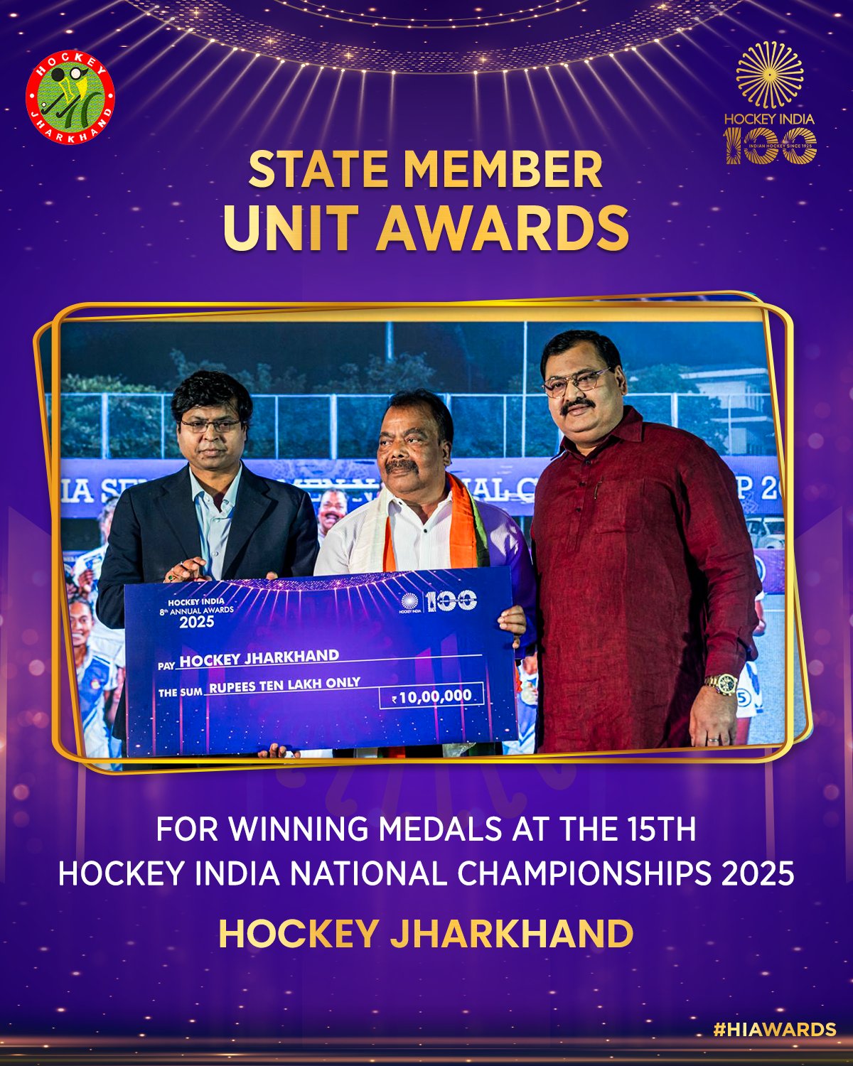 Hockey Jharkhand was awarded Best Member Unit of the Year 2025 (INR 2.5 lakh) for its efforts towards the development of hockey in the region.
