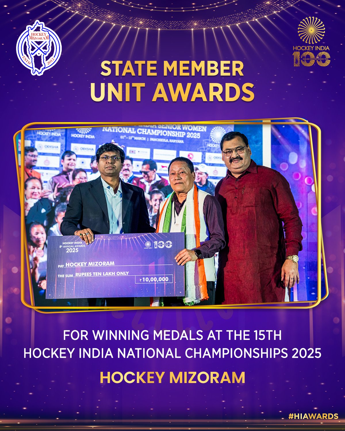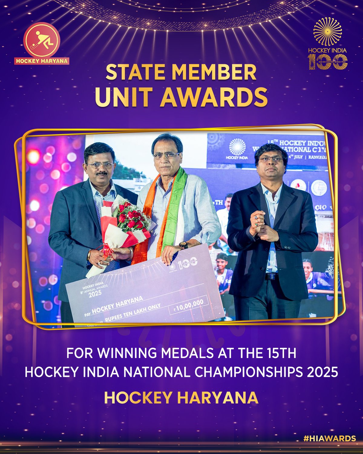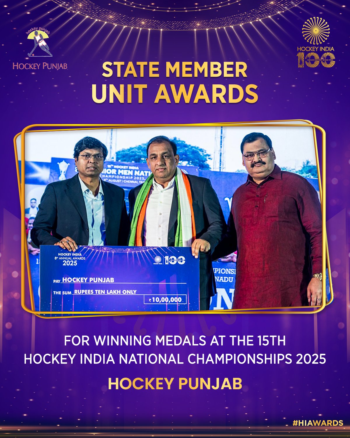 Seven Member Units were also awarded with INR 10 lakh each for their performances at the 15th Hockey India National Championships in 2025. The winners included Hockey Jharkhand, Hockey Haryana, Hockey Mizoram, Hockey Punjab, Hockey Madhya Pradesh, Hockey Association of Odisha, and Hockey Uttar Pradesh.