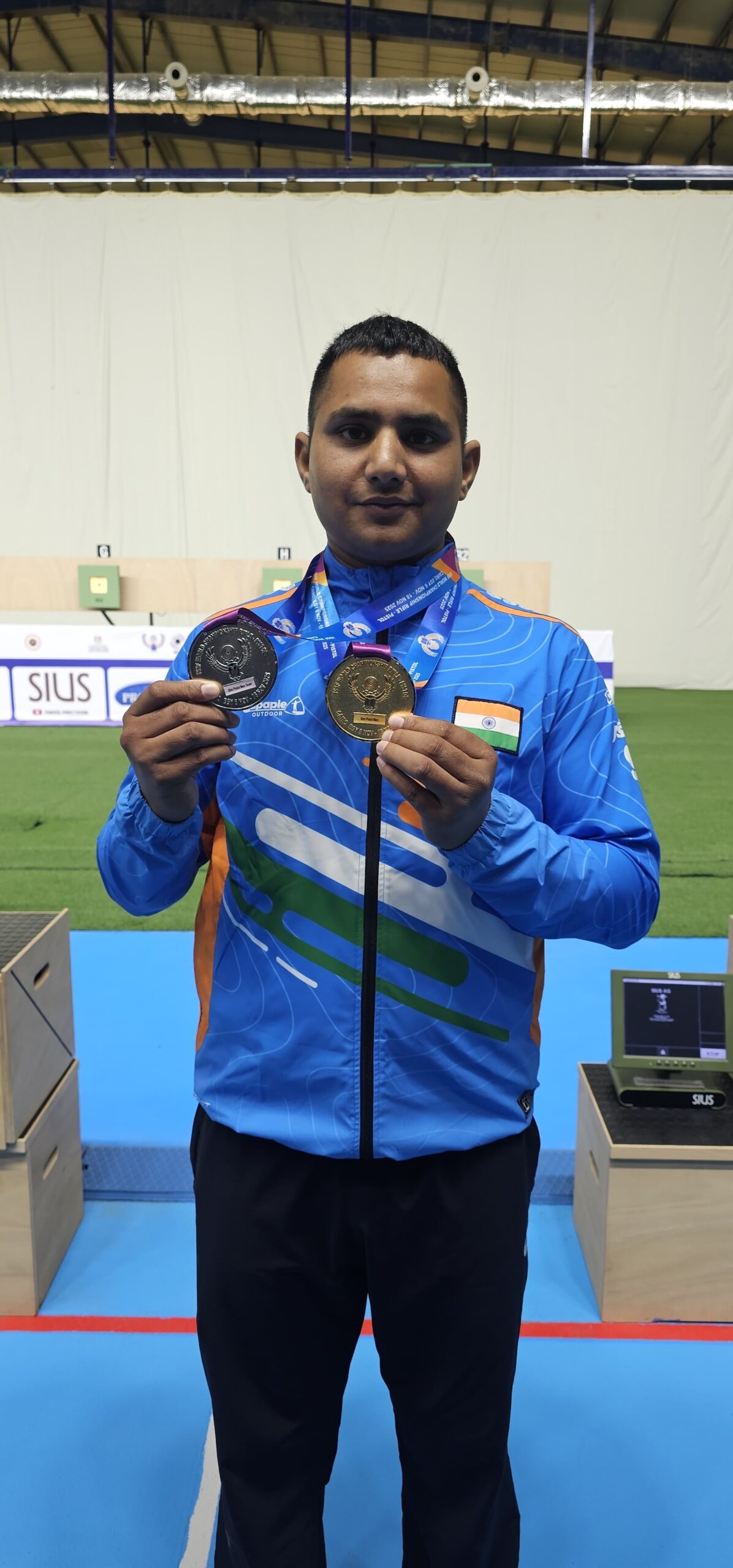 Ravinder Singh showing his men’s 50m pistol gold & team bronze in Cairo on Saturday (Nov 08, 2025).