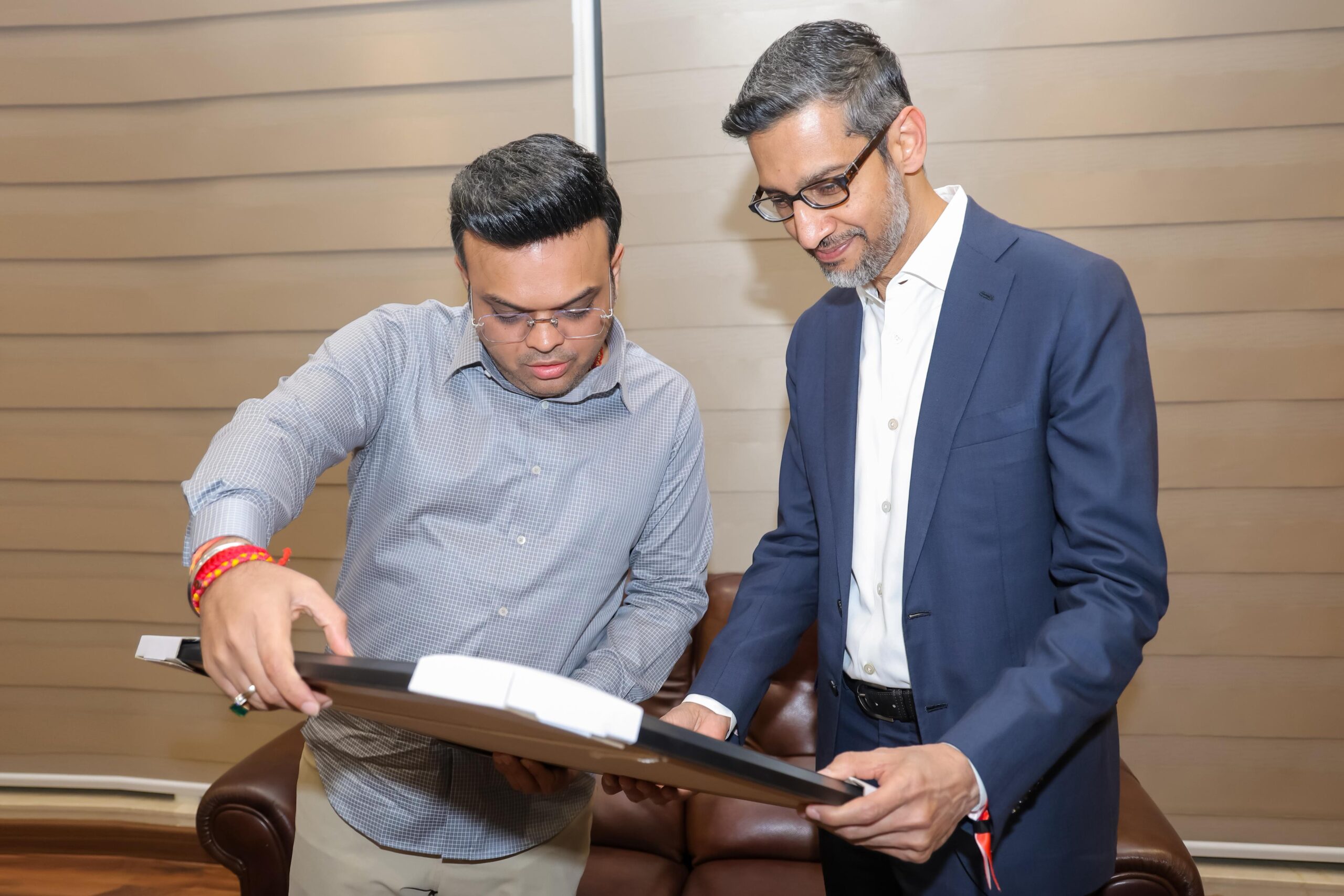 ICC Chair Jay Shah and Google CEO Sundar Pichai meet at ICC Men’s T20 World Cup Super 8 match between India and South Africa