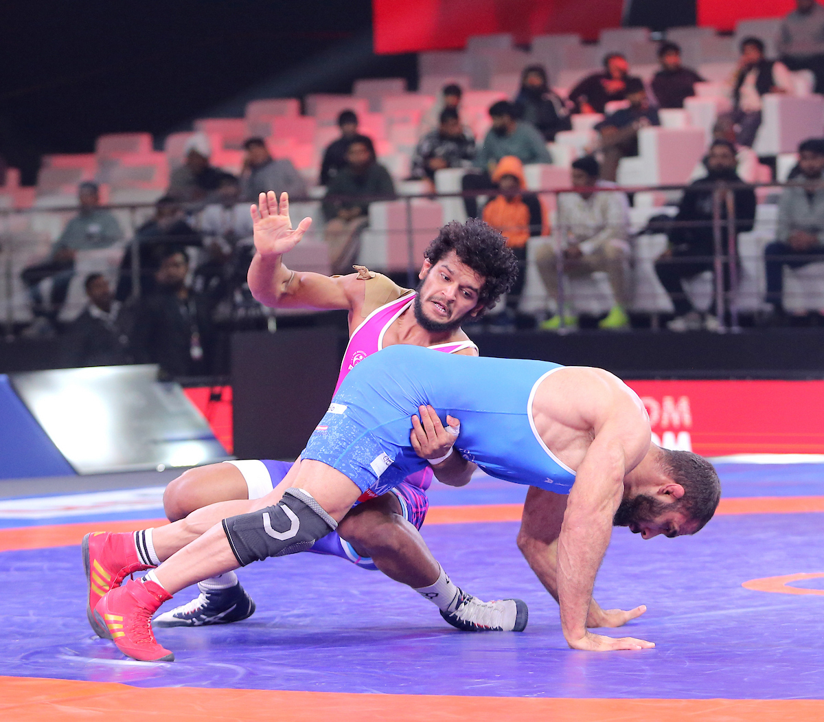 Delhi captain Sujeet Kalkal ensured there was no let-up in the 65kg men’s bout, registering a confident 9–2 win over Ali Rahimzade. Kalkal dominated the opening exchanges with consistent takedowns and mat control and added further points in the second period to secure two points for Delhi Dangal Warriors and take 5–0 lead.