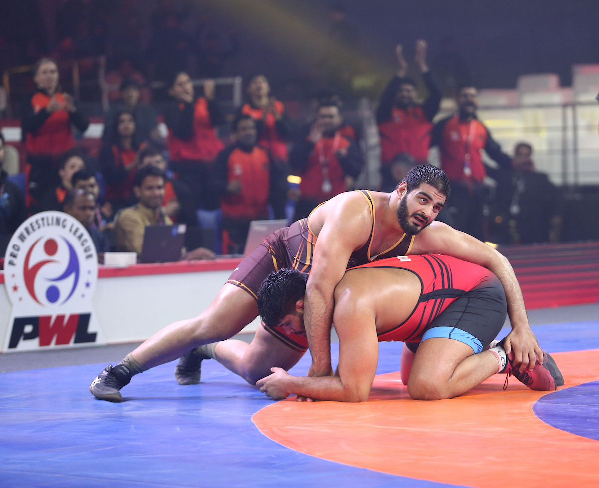 ANIRUDH GULIA FROM HARYANA THUNDERS IN MAROON VS DINESH DHANKHAR FROM PUNJAB ROYALS IN RED AT PRO WRESTLING LEAGUE 2026.