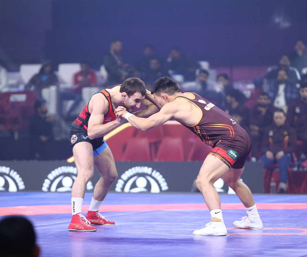 TUMUR OCHIR TULGA FROM HARYANA THUNDERS IN MAROON VS ISLAM GUSEINOV FROM PUNJAB ROYALS IN RED AT PRO WRESTLING LEAGUE 2026.