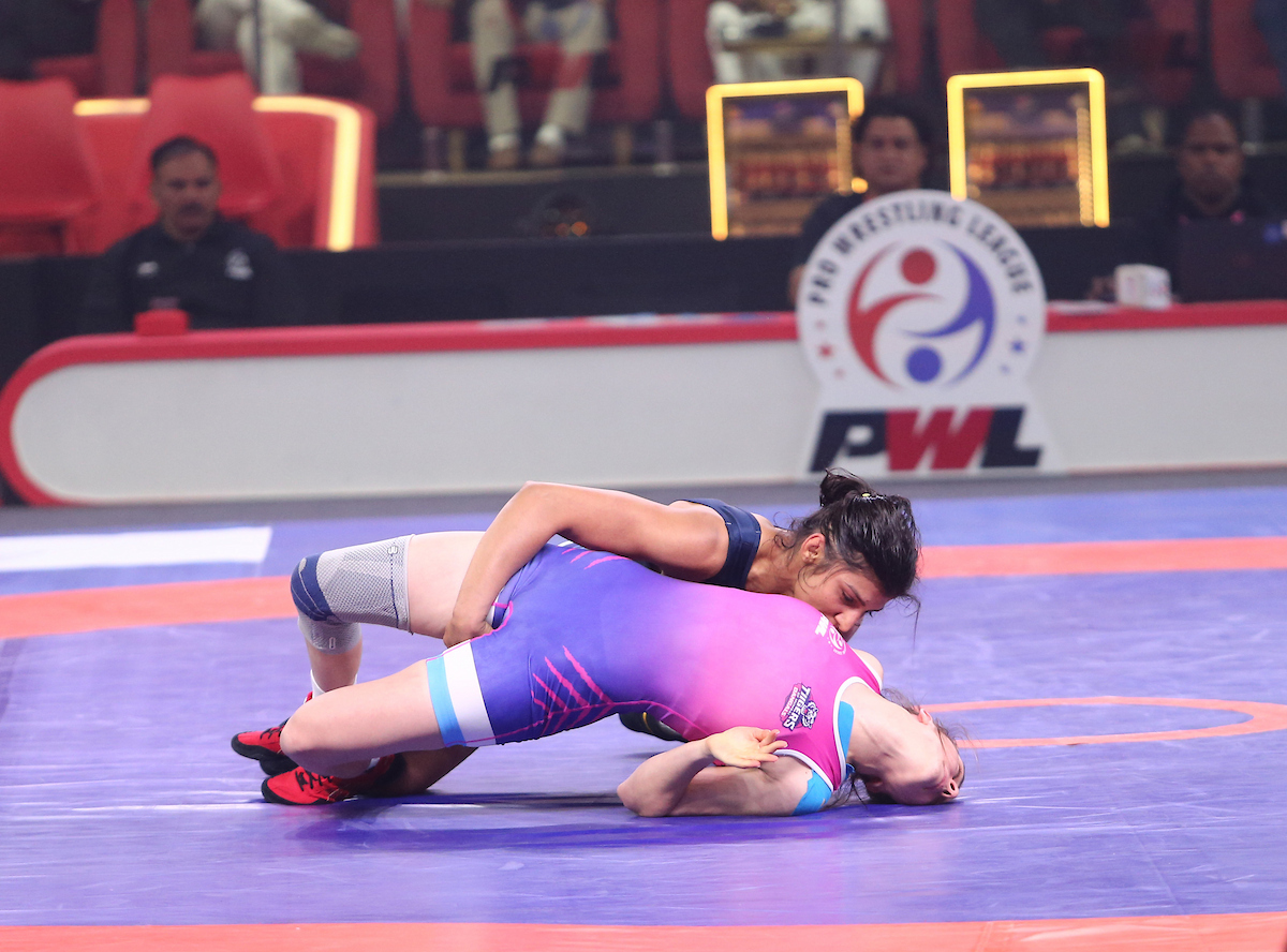 NISHA DAHIYA FROM UP DOMINATORS IN BLUE VS OLHA PADOSHYK FROM TIGERS OF MUMBAI DANGALS IN PINK AT PRO WRESTLING LEAGUE 2026