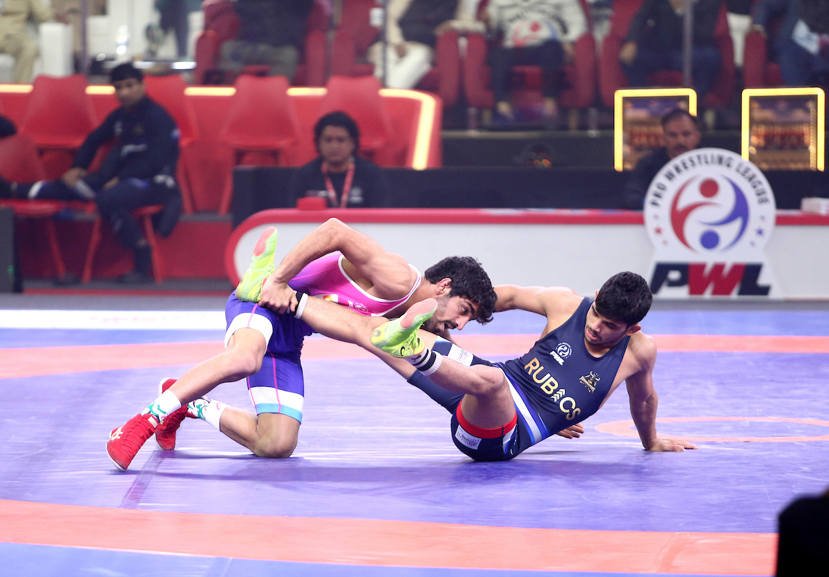SAGAR SHARMA FROM UP DOMINATORS IN BLUE VS AMAN SEHRAWAT FROM TIGERS OF MUMBAI DANGALS IN PINK AT PRO WRESTLING LEAGUE 2026