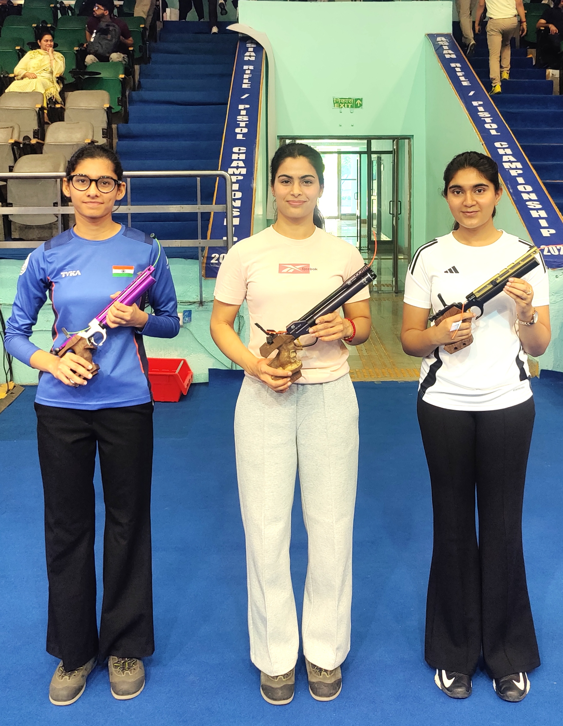 10m AP Women Winners – (L-R) Sainyam (Chandigarh), Manu Bhaker (Haryana), Esha Singh (Telangana).