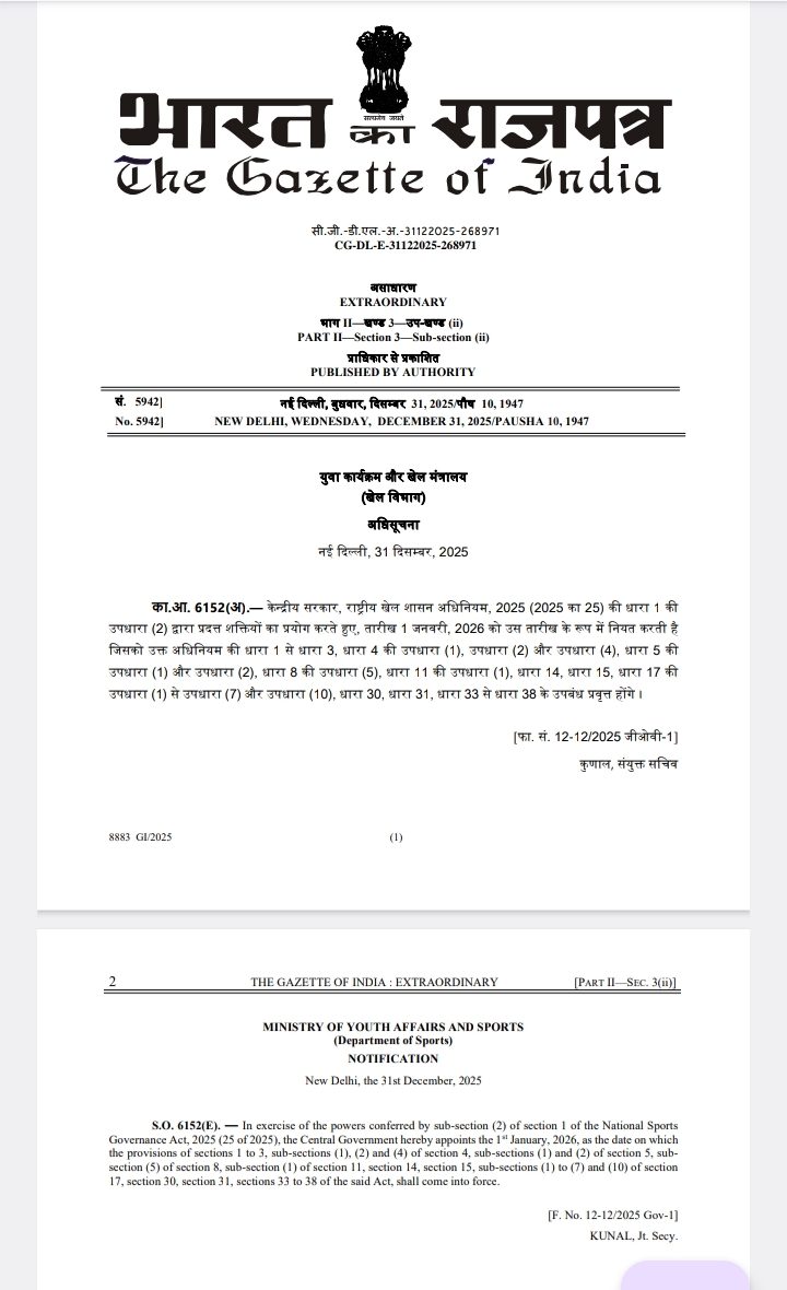 New Delhi: The Central Government has notified the commencement of select provisions of the National Sports Governance Act, 2025.