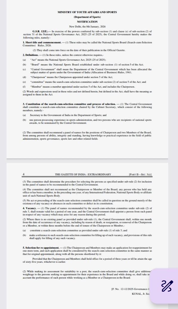 New Delhi; The Union Government has notified the National Sports Board (Search-cum Selection Committee) Rules, 2026 under the National Sports Governance Act, 2025.